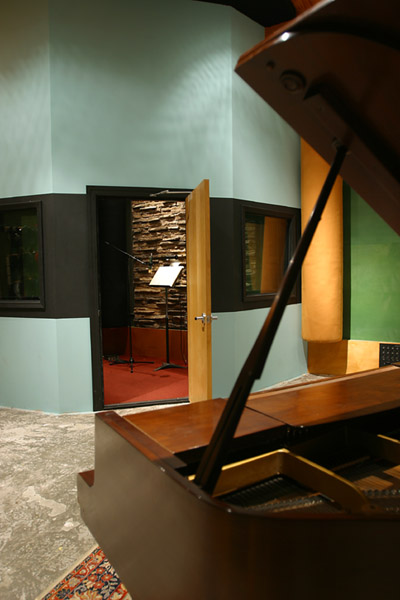Our live room, Studio A, is a 700 square foot room with 14 foot ceilings, two iso booths, and is centered by a Yamaha Grand Piano.